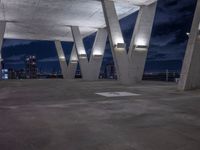 the concrete structure in the center of an empty area at night shows the city's silhouettes