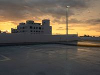 Sunset over a parking lot in Miami Beach, Florida. Buildings silhouette against the cloudy dawn sky. Concrete surface with an odd traffic sign and street lights. A unique view of Miami's urban landscape.