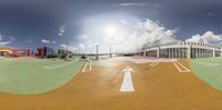 Aerial view of Miami Beach, Florida with a straight road cutting through the city. The urban skyline and skyscrapers create a concrete jungle. Open spaces and parking lots provide relief from the high-rise buildings. A sunny day in the bustling city.