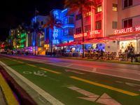 A lively scene in Miami Beach, Florida at night. People enjoy dining at an Aldi hotel with neon signs illuminating the sidewalk. The urban design showcases the city's vibrant nightlife and bustling shopping district.