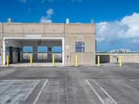a parking garage with several parking gates in a lot with blue sky and cloud cover