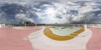 an empty skateboard ramp at a skate park with buildings in the background and clouds overhead