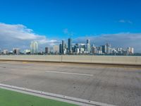 a highway with a green bike path and a cityscape in the distance with a blue sky