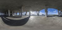 A panoramic view of an abandoned building in Miami, Florida. The interior features multiple circular windows, while the cityscape and skyline can be seen through them. The concrete surfaces and hard shadows create a gritty urban atmosphere.