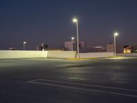 a parking lot at night with lights illuminating on it's edges and an apartment building in the background