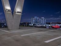 some cars parked on the asphalt at night with buildings in the background near a bridge