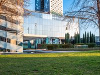 This photo showcases a modern office building in Barcelona, Spain. The clear sky above highlights the sleek architecture and glass windows of the building. The walkway leading up to the building is flanked by a grassy area with plants on either side. The urban design of the business district is evident, with a paver road and hard shadows cast by the low sun. This image captures a typical day in the vibrant city of Barcelona, where modern architecture meets urban charm.