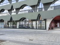 This stock photo showcases the modern architecture in Berlin, Germany. The city's urban design and business district come to life in this image, featuring a contemporary residential building with a beautiful facade. The concrete plaza, cobble stone road, and arcades add to the charm of this European city. Perfect for illustrating urban living and the dynamic atmosphere of Berlin.