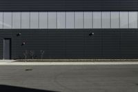 This image captures a modern low-rise building with black walls in Toronto, Canada. The architectural design features a rectangular shape and composite material facade. The building stands next to a sidewalk with shrubbery in front, creating a suburban atmosphere. The grey asphalt road surface and hard shadows further enhance the urban design. The clear sky above provides a contrast to the building's dark color. This photo represents a typical day in Toronto, showcasing the city's modern architecture and urban landscape.