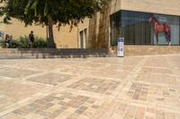 A clear sky shines above Cordoba, Spain, highlighting a modern architectural marvel. In an urban setting, a sign stands on a brick pavement, drawing attention from passersby. People can be seen walking around the area, creating a bustling atmosphere. The building showcases exceptional design and stands as a testament to the city's rich architectural heritage. This image captures the vibrant atmosphere and urban charm of Cordoba, making it an ideal representation of the city's modern architecture.