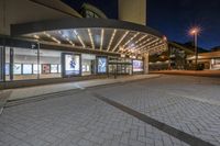 This image captures the vibrant city life of Toronto, Ontario, Canada at night. The modern architecture of a mixed-use building shines brilliantly with lights illuminating through the glass windows. The building is located in the heart of the business district, surrounded by other office buildings and hotels. The busy road surface is filled with transport vehicles, showcasing the metropolitan atmosphere of the city. In the foreground, a plaza with a courtyard provides a space for pedestrians to relax and enjoy the urban design. This photo represents the dynamic and bustling nightlife of Toronto's business district.