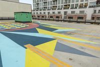 A vibrant and modern cityscape in Toronto, Canada. High-rise apartment buildings and office headquarters contrast with open green spaces. Colorful graffiti walls add an artistic touch to the urban design.