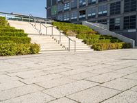 This image captures the modern urban design and architecture of Berlin, Germany. A man is seen riding a skateboard down a concrete staircase surrounded by lush vegetation. The open space and clear sky above create a sense of freedom and vibrancy in the city. The modern buildings and paver surface of the road reflect the innovative design of the city. Berlin's urban landscape combines the elements of nature and urban life seamlessly. This photo showcases the energetic atmosphere of the city and its integration of sport, architecture, and vibrant city life.