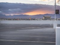 A breathtaking view of modern architecture in Las Vegas at dawn. This city is known for its stunning skyline, and this image captures the unique blend of concrete structures, open spaces, and water features. The sunlight casting a warm glow on the buildings and the clear sky in the background create a serene atmosphere. The surface of the road and the parking lot are visible, reflecting the afterglow of the dawn. The image showcases the urban beauty of Las Vegas with its distinctive street lights and the majestic lake in the distance. Discover the allure of this vibrant city with its seamless mix of contemporary buildings and natural elements.
