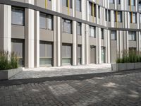 This is an image of a modern architecture office building in Berlin. The metal wall of the building contrasts with the surrounding cobblestone surface and the trees and plants in the area. The business district provides a busy and vibrant atmosphere to the scene. The outside patio of the building features a bench, inviting people to sit and enjoy the surroundings. This photo captures the essence of Berlin's architecture and business culture.