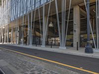 A modern architecture building in the heart of a bustling city. The sleek facade showcases a perfect symmetry, with glass and metal materials used. The road surface and track lead tourists to this iconic tourist attraction.