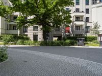 A modern residential area in Berlin, Germany. The cobblestone road and architecture add to the charm of this vibrant city. The urban design is surrounded by lush vegetation and trees, creating a perfect blend of nature and city life.