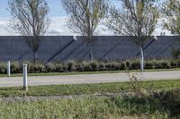 This is an image of a modern suburban architecture in Ontario, Canada. The photo shows a residential area with clear sky in the background. The asphalt road is lined with wire fencing and concrete walls, indicating a well-defined boundary. The field next to the architecture is filled with vegetation, shrubs, and perennials. In the distance, there is a factory surrounded by land lots and plantations. The overall scene represents a typical day in a suburban area in Ontario.