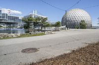 a big ball surrounded by some buildings on a lot near water and trees and grass
