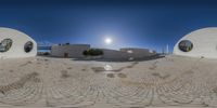 A modern beach house in Lisbon, Portugal, with a panoramic view. The house features large circle windows and round mirrors, creating a symmetrical and stylish facade. The clear sky and sunny weather enhance the vibrant colors and tints of the sandstone walls.