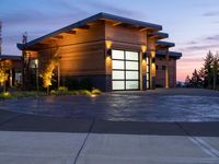 A beautiful modern garage with a large sliding door bathed in the warm evening sunlight. The dusk sky creates a stunning backdrop, highlighting the sleek design and open space. A perfect combination of form and function.