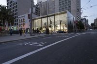 This stock photo features a very modern looking glass building on the side of the street in San Francisco, California. The cityscape is illuminated by the break of day, creating a stunning contrast between the clear sky and the dark surroundings. The architectural design of the building showcases modern architecture and reflects the urban design of the metropolitan area. The road surface, made of asphalt, creates a sense of motion blur, adding dynamism to the image. The building is located in a bustling neighborhood, surrounded by other high-rise condominiums. The infrastructure of the city is well represented in this photo, highlighting the urban lifestyle and the vibrant city life of San Francisco.