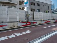 the man is riding his bicycle down the street next to a guard line that has arrows pointing up