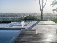 A stunning modern home in Los Angeles, California, overlooks a spacious open yard. The beautiful landscape with trees, vegetation, and a pool adds to the serenity. Enjoy the breathtaking view of the city below.