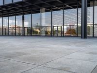 A modern office building located in the financial district of Berlin. The tiled floor outside is surrounded by glass walls, giving it a sleek and contemporary look. This urban design is a perfect representation of city life in Europe.