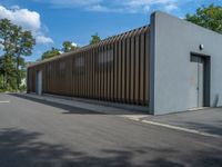 a metal building with a corrugated door in front of it and trees lining the street behind it