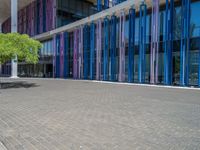 a building with pink glass and purple striped exterior is shown with the brick path on the left