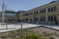 This image showcases a modern office building in Toronto, Canada. The building features a striking design with a clear sky in the background. The courtyard of the building is surrounded by lots of green trees, creating a refreshing and tranquil atmosphere. The architecture of the building blends seamlessly with the urban environment of the city. The brownstone and brick exterior adds a touch of elegance to the overall aesthetic. The image captures the essence of the bustling business district of Toronto, where modern architecture and urban design thrive.