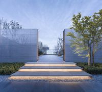 a walkway leads to a building and the building has stone walls and a lighted door