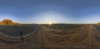 an image of the sun setting on a desert road as seen through a fisheye lens