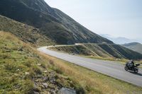 This stock photo shows a person riding their motorcycle down a paved road in the mountains near majestic mountains and a flowing stream. The winding road traverses through picturesque landscape, filled with lush green grass, vibrant vegetation, and surrounded by a beautiful natural setting. The clear daylight illuminates the scene, casting shadows of the passing clouds on the road surface. The motorcycle's tires grip the smooth asphalt, navigating the curving terrain effortlessly. The image captures the thrill and freedom of riding through the picturesque countryside of Italy in Europe, creating a sense of adventure and exploration. A lovely entryway to explore the garden of Italy's diverse scenic beauty and breathtaking slopes.