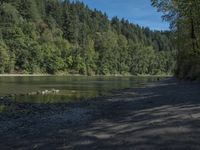 A beautiful coastal landscape with a sandy beach, clear blue water, and lush vegetation. The open space is dotted with trees and hills, creating a picturesque view. The sky is filled with fluffy clouds, adding to the scenery's charm.