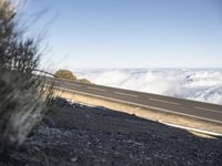 This image captures the stunning landscape of Tenerife, Spain. The photo shows a high road with asphalt winding through the mountains, overlooking the ocean. The clear sky above contrasts with the clouds below, creating a breathtaking sight of being above the clouds. The Armco barriers and guard rails ensure safety on this elevated road. This winter day in Europe showcases the beauty of nature and the infrastructure that connects different parts of the continent. The combination of mountains, trees, and the vast horizon creates a picturesque scene that is unique to Tenerife.