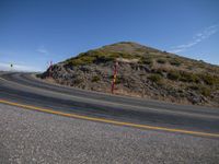 Curved road cutting through a mountainous landscape. The smooth asphalt surface contrasts with the rugged vegetation. Blue sky and partially cloudy backdrop create a picturesque scene of nature.