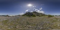 a field with some rocks near a mountain with a clear sky in the background and the sun