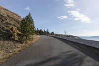A straight road leading through the mountainous landscape of British Columbia, Canada. The road surface is made of asphalt and lined with Armco barriers. The picturesque Okanagan Valley and Lake provide a breathtaking backdrop.