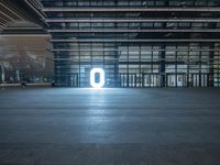 a large empty room is lit up with neon lights, inside a skyscraper building there are various windows
