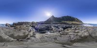 A stunning coastal landscape in New Zealand. The clear sky and open space create a serene atmosphere. The sun rises over rocks and water, casting a warm glow. A perfect day for recreational activities by the ocean.