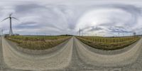 A panoramic view of the New Zealand countryside, featuring windmills against a grey sky. Empty dirt roads lead through the rural landscape, surrounded by nature and agriculture. Experience the tranquility of Wairarapa in New South Wales.