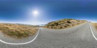 A scenic road in New Zealand's South Island, winding its way up a highland hill. The asphalt road contrasts with the clear sky and offers breathtaking views of the surrounding mountain range. A perfect day for exploring the natural beauty of this elevated landscape.