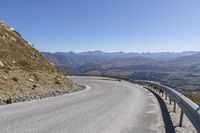 A scenic drive along a winding mountain road in New Zealand's South Island. Clear skies and low-lying clouds highlight the beautiful mountain range. The asphalt road curves through highland valleys, with Armco barriers for safety.