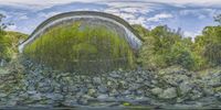 a circular, green tunnel with rocks and trees near by on the bank of the river