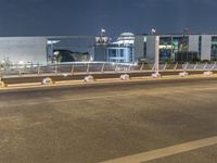 This is an image of a modern office building in Berlin, Germany. The city's urban design is highlighted by the architecture and street lights that illuminate the night. The business district can be seen in the background, with trucks and cars on the asphalt road. The bridge extends across the horizon, connecting different parts of the city. Vegetation adds a touch of nature to the urban landscape. The image captures the vibrant atmosphere of Berlin's business and architectural scene at night.