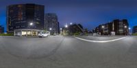 a photo of an urban street intersection at night, shot from fish eye lens with a camera