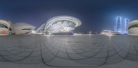 A futuristic cityscape at night, with modern architecture and open spaces. The straight road leads to a plaza surrounded by artistic buildings. The clear sky and artificial lights create a mesmerizing scene.