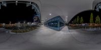A 360-view of a skateboard park in Taranaki, New Zealand at night. The city's modern architecture and artificial lights create a vibrant urban atmosphere. Concrete surfaces and asphalt roads contrast with the open spaces. A perfect representation of city life in Taranaki.